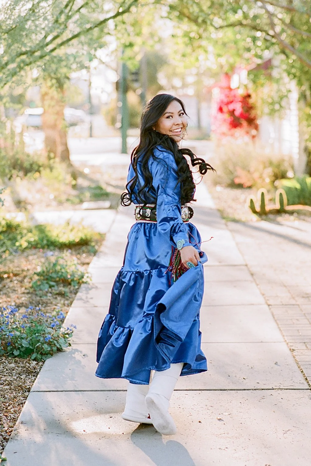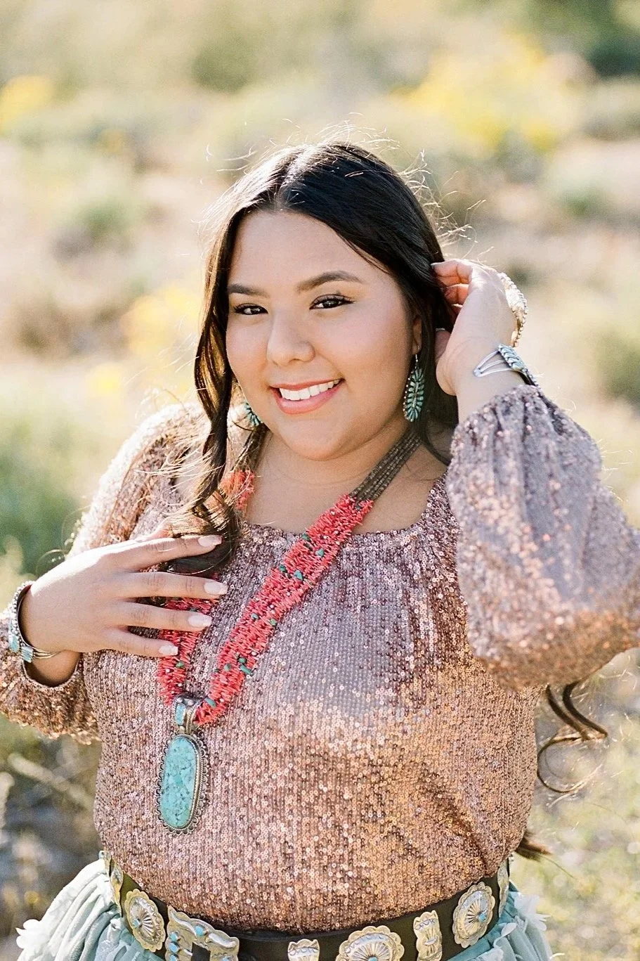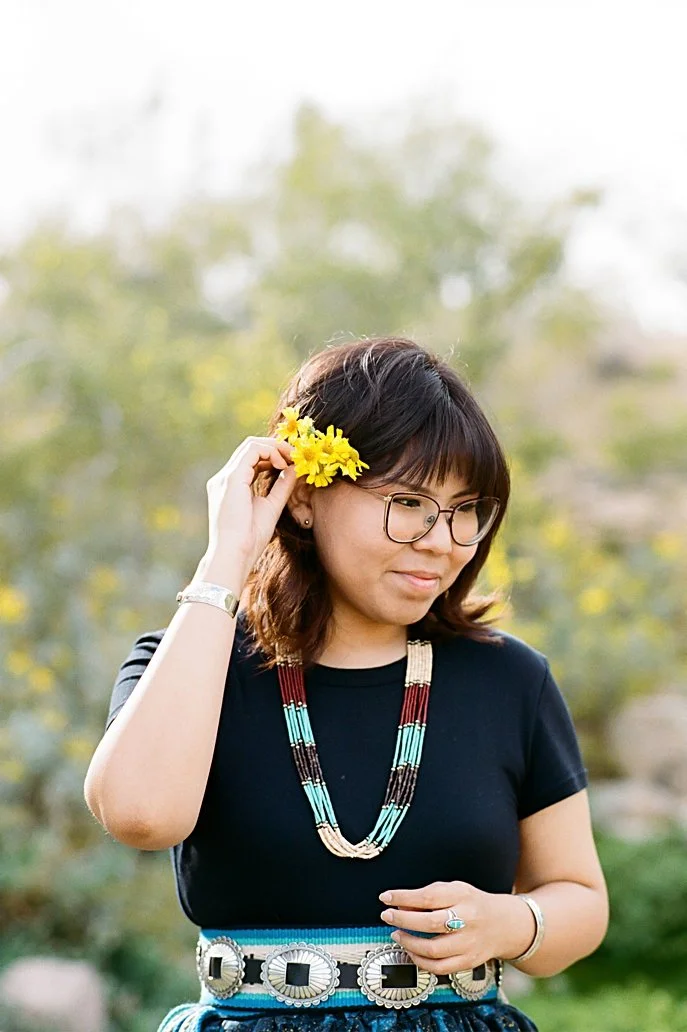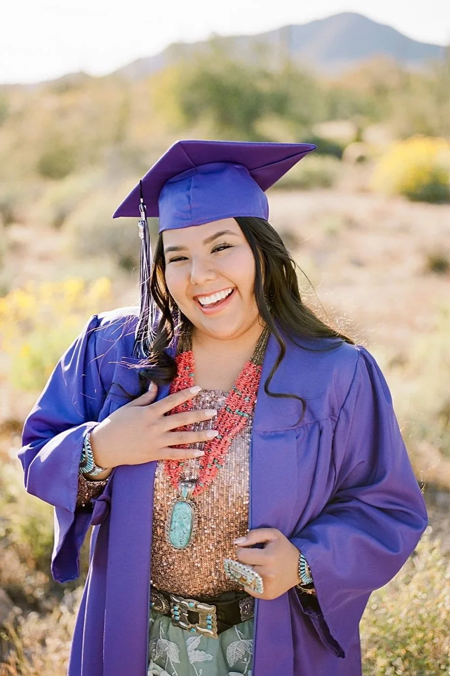 Based in Chandler, Arizona, I am proud to be of Diné/Navajo heritage, my maternal clan is Táchii’nii and my paternal clan is Ashiini. My cheiis are Ta’neeszahnii and my nalis are Tlaashichi’i. I am happily married to my college sweetheart, and together we are blessed with a wonderful son. I cherish quality time with my family, including our adorable pups, Goose and Kiwi.